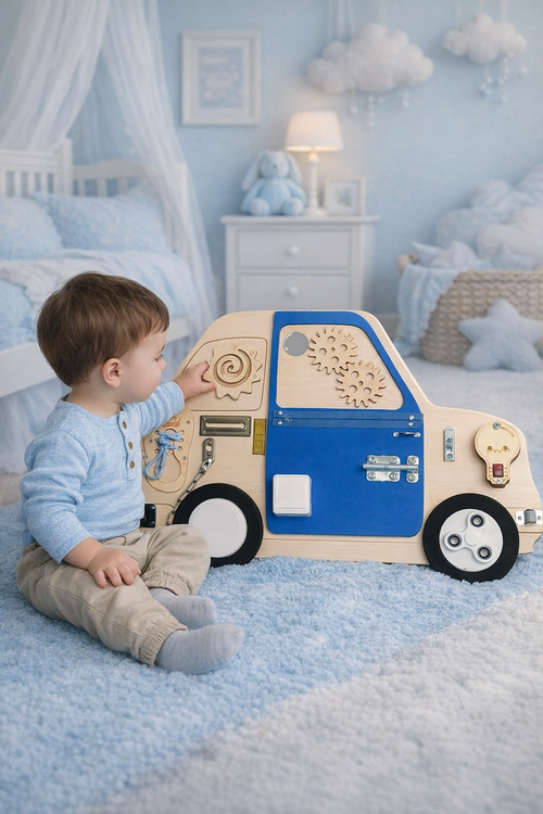 Tavola manipolativa Montessori a partire dai 12 mesi, macchinina con supporto.